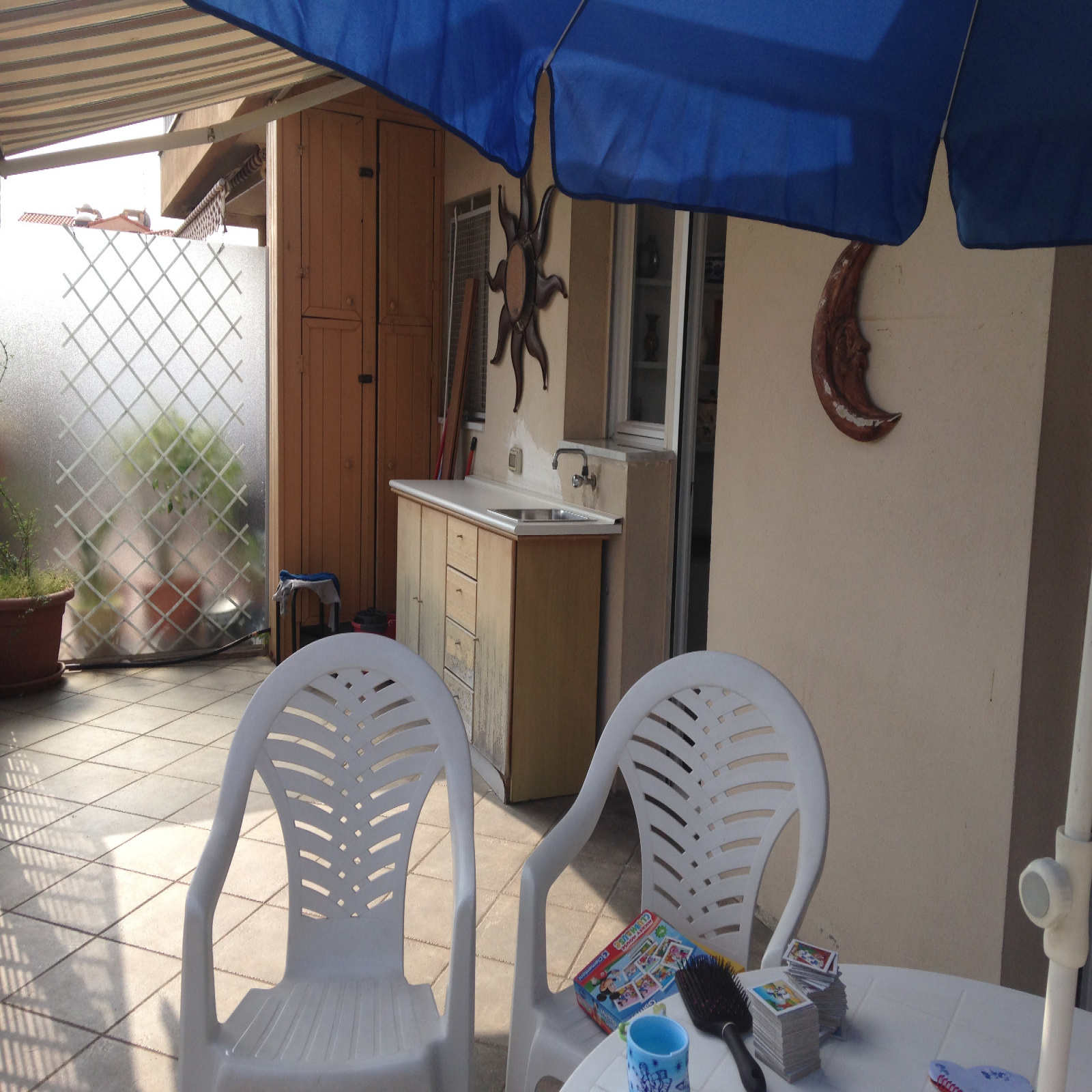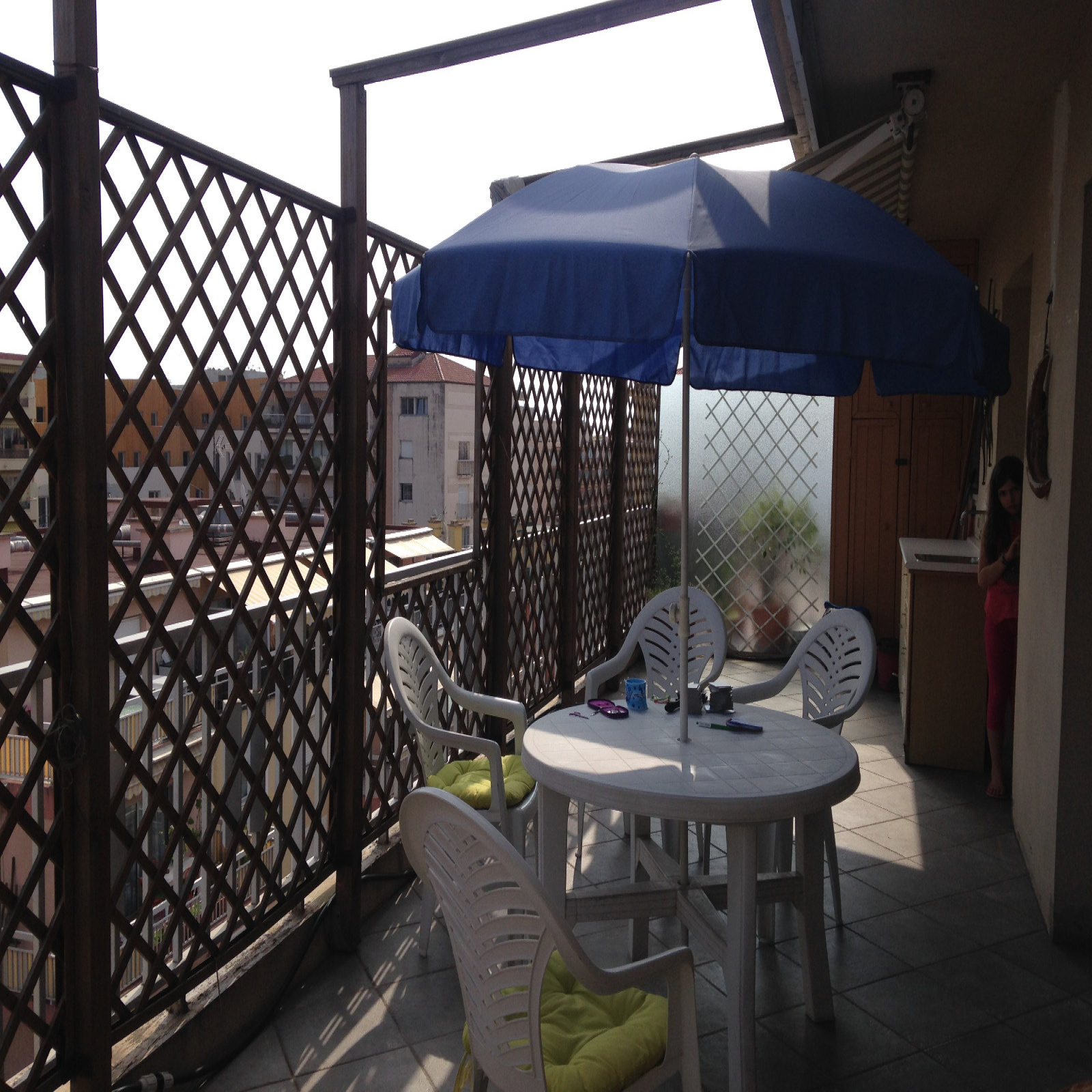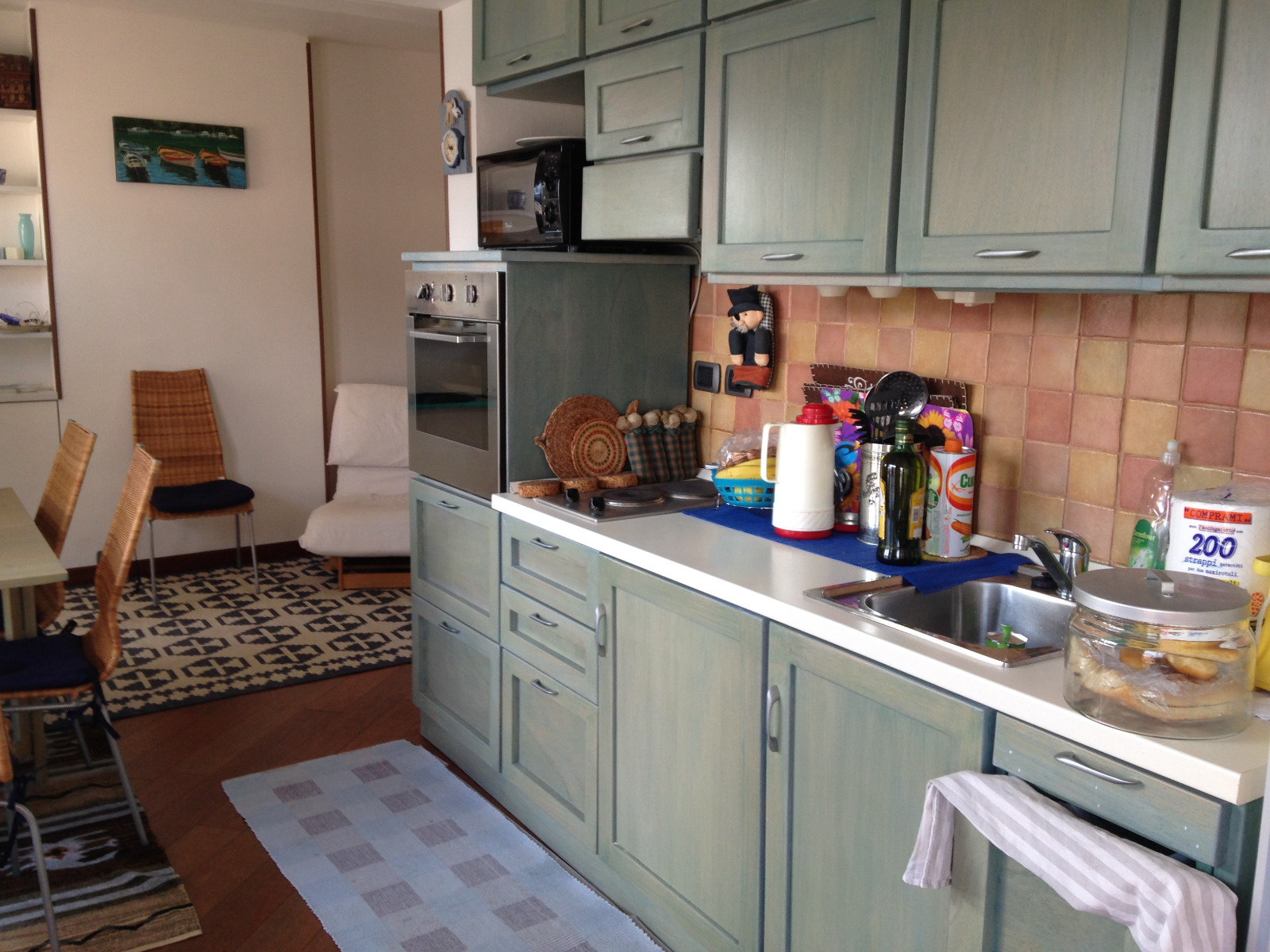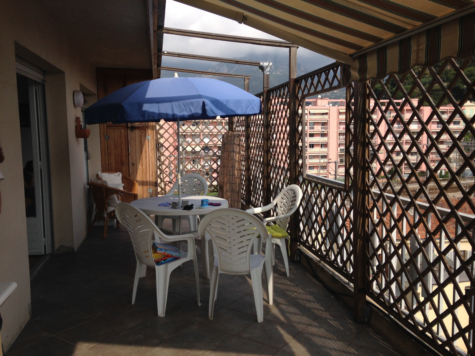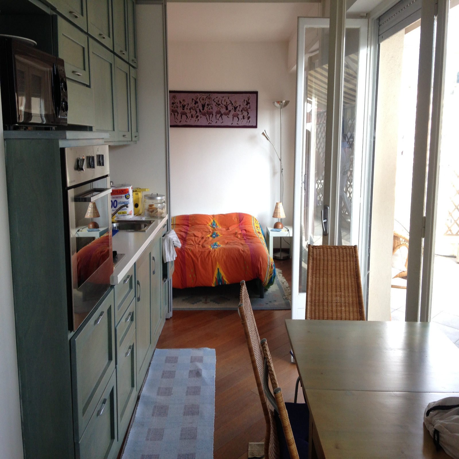 L’appartement est composé d’une entrée – salon avec canapé lit clic-clac 2 personnes, TV donnant sur grande terrasse - cuisine américaine avec four, plaque électrique 2 feux, hotte, micro ondes, réfrigérateur/freezer – une chambre avec un lit 2 personnes 160cm donnant sur terrasse, placard - une salle de bains avec lavabo, baignoire, lave linge. Belle terrasse avec jolie vue