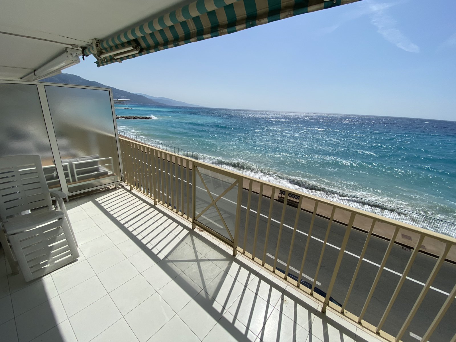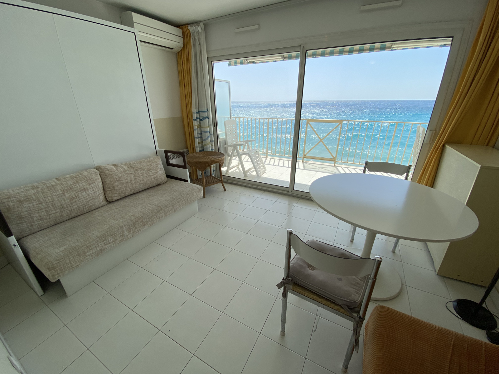 Un STUDIO (REF 0103) situé résidence " DELL’ARTE " - 2° étage (ascenseur) - 12 Avenue Du Général De GAULLE - MENTON - 10 min du Casino - Immeuble Front de Mer - Appartement face mer avec belle terrasse - Exposition Sud. Il est composé : 1 entrée avec placard, 1 séjour avec 1 canapé lit abattable 2 personnes, Télévision - cuisine équipée avec lave linge, petit réfrigérateur, four micro ondes, 2 plaques de cuissons électriques - salle de bains avec WC – Terrasse face mer, climatisation.