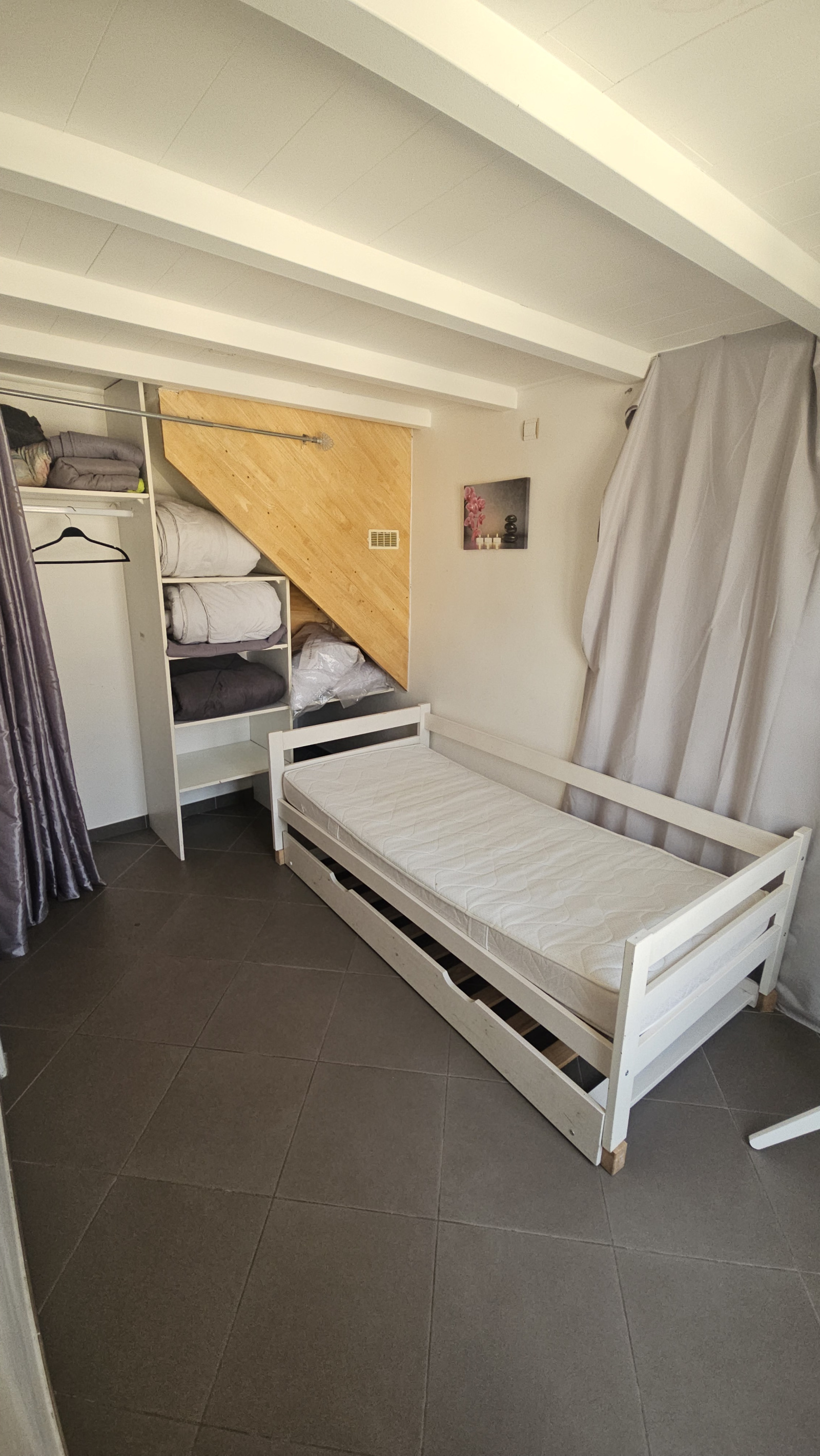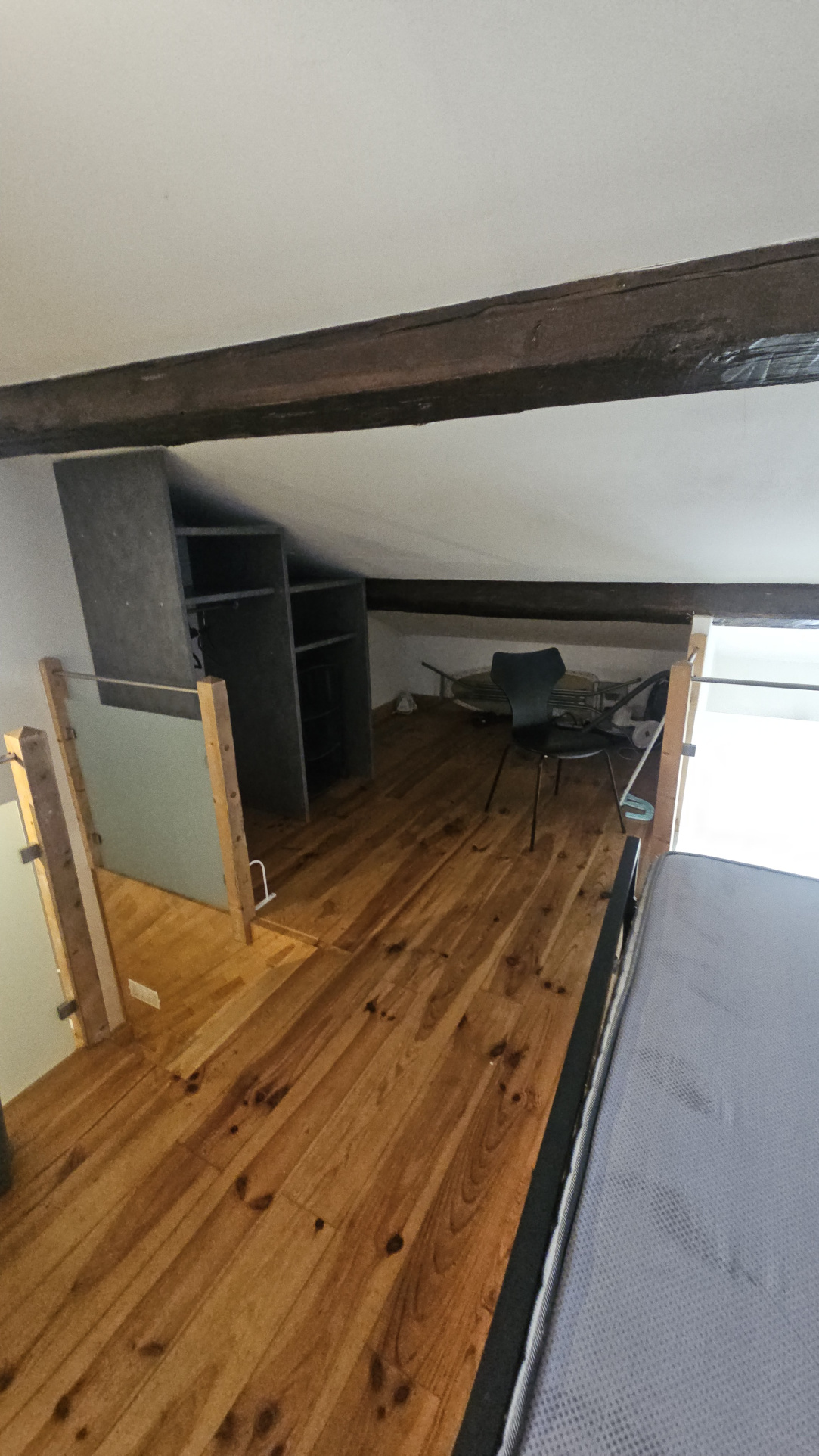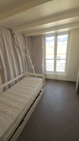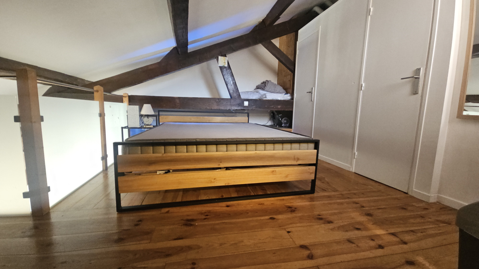 À l’étage, une mezzanine accueille une seconde chambre ainsi qu’une salle de bains, apportant un espace nuit distinct et une belle sensation de volume.